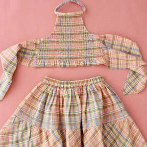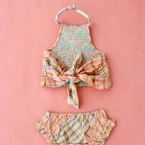 From Bonjour’s new Spring / Summer 2023 collection. Beautifully smocked halter top with scarf-like tie and matching bottoms. Fabricated in a cheery rainbow plaid. Wear this two-piece set as separates for added wearability.