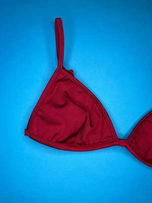 Fixed triangle top with sliders on the back straps for adjustment. Deep red with metallic sheen for added sparkly fun.